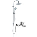Устройство: душевая система • Смеситель: джойстик • Ручной душ (душевая лейка): размер 125 мм, настройки 5 шт • Верхний душ (тропический): размер 225 мм, настройки 1 шт • Комплектация: ручной душ, верхний душ, смеситель, стойка, шланг, крепление ручного душа, мыльница
