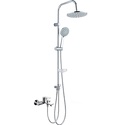 Устройство: душевая система • Смеситель: джойстик • Ручной душ (душевая лейка): размер 125 мм, настройки 5 шт • Верхний душ (тропический): размер 225 мм, настройки 1 шт • Комплектация: ручной душ, верхний душ, смеситель, стойка, шланг, крепление ручного душа, мыльница