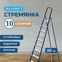 Стремянка Алюмет 10 ступеней арт М8410 Стремянка стальная для бытового использования Прямоугольный стальной профиль 40х20 мм. окрашенный полимерной краской Ширина основания 0,58 м. Длина в сложенном виде 2,90 м. Алюминиевые рифленые ступени Максимальная нагрузка 150 кг.