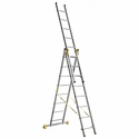 Алюминиевая трехсекционная лестница Алюмет с 8 ступенями предназначена для работы на высоте от 3,30 м до 6,11 м. Ширина ступеней 33/41/48 см позволяет свободно подниматься и спускаться. Универсальное изделие может раскладываться как стремянка, а также использоваться как односекционная приставная лестница. Опоры из толстого профиля выдерживают статическую нагрузку до 150 кг. Стремянка фиксируется в рабочем положении страховочными ремнями. Для крепления секций используются упоры.