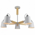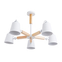 оригинальный светильник, который по достоинству оценят любители современных и уютных интерьеров. в осветительном устройстве удачно сочетаются конструктивные элементы из дерева и металла. каждый из 5 плафонов в виде усеченного конуса имеет боковое крепление к рожку оснащённое шарнирным узлом. данное решение позволяет изменять направление потока света для каждого источника отдельно. общий цвет люстры белый, который органично будет смотреться в любом помещении.