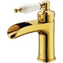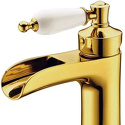 Назначение: для умывальника • Конструкция: однорычажный • Монтаж: горизонтальный • Материал: покрытие - золото • Монтажные отверстия: 1 отверстие • Форма излива: каскадная • Душевая лейка в комплекте: нет • Донный клапан в комплекте: есть
