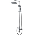 Устройство: душевая система • Смеситель: джойстик • Ручной душ (душевая лейка): размер 102 мм, настройки 3 шт • Верхний душ (тропический): размер 228 мм, настройки 1 шт • Комплектация: ручной душ, верхний душ, смеситель, стойка, шланг, крепление ручного душа
