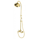 Устройство: душевая система • Смеситель: двухвентильный • Ручной душ (душевая лейка): настройки 1 шт • Верхний душ (тропический): размер 200 мм, настройки 1 шт • Комплектация: ручной душ, верхний душ, смеситель, стойка, шланг, крепление ручного душа • Покрытие: под золото