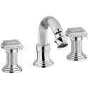 Назначение: для биде • Конструкция: двухрычажный • Монтаж: горизонтальный • Клапан: керамический • Материал: латунь, покрытие - бронза • Подводка: гибкая • Монтажные отверстия: 3 отверстия • Форма излива: традиционная • Душевая лейка в комплекте: нет • Аэратор: есть • Донный клапан в комплекте: есть