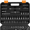 Набор: 165 шт • Ключи: рожковые, шестигранные, разводной • Головки: 6-ти гранные головки, свечные • Ключей-трещоток: 1 шт • Хранение: пластиковый кейс