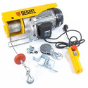 Устройство: лебёдка • Привод: электрический, канатный • Грузоподъемность: 500 кг, с блоком 990 кг • Подъем: 12 м, с блоком 6 м • Длина каната/цепи: 12 м