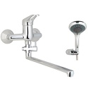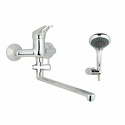 Назначение: универсальный • Конструкция: однорычажный • Монтаж: вертикальный • Клапан: керамический • Материал: латунь, покрытие - хром • Подводка: жесткая • Монтажные отверстия: 2 отверстия • Форма излива: традиционная • Душевая лейка в комплекте: есть • Держатель для душевой лейки: настенный держатель • Аэратор: есть • Донный клапан в комплекте: есть