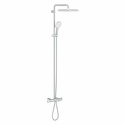 Устройство: душевая система • Смеситель: термостатический, от стены 169 мм • Ручной душ (душевая лейка): размер 110 мм, настройки 2 шт • Верхний душ (тропический): размер 250 мм, настройки 1 шт • Комплектация: ручной душ, верхний душ, смеситель, стойка, шланг, крепление ручного душа