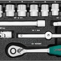 Комплектация- Головки торцевые, 17 шт.: 6, 7, 8, 9, 10, 11, 12, 13, 14, 15, 16, 17, 18, 19, 20, 21, 22 мм.;- Свечная головка, 2 шт.: 16, 21 мм.;- Рукоятка трещоточная, 185 мм. ;- Удлинители, 2 шт.: 75 и 150 мм.;- Вороток Т-образный, 200 мм.;- Шарнир карданный.