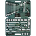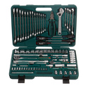 Комплектация1/2’’ DR:- Торцевые головки, 20 шт.: 8, 9, 10, 11, 12, 13, 14, 15, 16, 17, 18, 19, 20, 21, 22, 23, 24, 27, 30, 32 мм;- Торцевые головки Е-профиль внешний Torx, 5 шт.: Е-11, Е-12, Е-14, Е-16, Е-18;- Торцевые головки свечные, 2 шт.: 16 и 21 мм;- Удлинители, 2 шт.: 1250 и 250 мм;- Удлинитель с шаром 50 мм;- Трещоточная рукоятка;- Вороток Т-образный 250 мм;- Шарнир карданный.1/4’’ DR:- Торцевые головки, 9 шт.: 4, 4.5, 5, 5.5, 6, 7, 8, 9, 10 мм;- Торцевые головки Е-профиль внешний Torx, 6 шт.: Е-4, Е-5, Е-6, Е-7, Е-8, E-10;- Шарнир карданный;- Вороток Т-образный 130 мм;- Трещоточная рукоятка, 36 зубцов;- Адаптер для вставок (бит);- Отверточная рукоятка 150 мм;- Вставки (биты), 20 шт.:- Шестигранные Нех, 8 шт.: 3, 4, 5, 6, 7, 8, 10, 12 мм;- Torx, 8 шт.: Т15, Т20, Т25, Т27, Т30, Т40, Т45, Т50;- Spline, 4 шт.: М6, М8, М10, М12.- Гибкий удлинитель 145 мм;- Ключи комбинированные, 14 шт.: 8, 10, 11, 12, 13, 14, 15, 16, 17, 18, 19, 21, 22, 24 мм;- Ключи разрезные, 4 шт.: 8х10, 11х13, 12х14, 17х19 мм;- Ключ разводной 8’’ (200 мм);- Отвертки, 4 шт.: (+) PH 1x80 мм, (+) PH 2х100 мм, (-) SL 1х5,5х125, (-) SL 1,2х6,5х150;- Ручка магнитная;- Пассатижи 7” (175 мм).