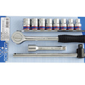 Комплектация- Удлинитель 5";- Вороток скользящий;- Трещотка;- Держатель для головок;- Головки 10, 11, 13, 14, 15, 17, 18, 19 мм;- Упаковка - блистер.