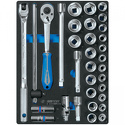 КомплектацияГоловки торцевые стандартные 6-гранные: 8, 9, 10, 11, 12, 13, 14, 15, 16, 17, 18, 19, 20, 21, 22, 23, 24, 25, 26, 27, 28, 29, 30, 32 ммГоловка свечная 12-гранная: 14 ммГоловка свечная 12-гранная: 16 ммТрещотка флажковая: 250 мм, 32 зубцаУдлинители: 75, 125, 250 ммВороток с шарниром: 380 ммВороток скользящий: 300 ммКардан: 77,5 мм