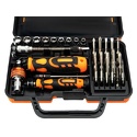 КомплектацияУдлиненные биты (45 мм): PH1.0, PH1.5, SL2.0, Pentable P2, P5, T2Удлиненные биты (60 мм): PH1, PH2, SL5, SL6, T20, T25, H5.0, H6.0, PZ1, PZ2Головки: M5, M6, M7, M8, M9, M10, M11, M12, M13ПереходникУдлинительГибкий удлинительРукоятка*2Рукоятка реверсивная с изменением угла крученияПосадка бит: 1/8