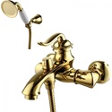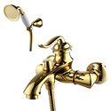 Назначение: ванна+душ • Конструкция: однорычажный • Монтаж: вертикальный • Клапан: керамический • Материал: покрытие - золото • Подводка: жесткая • Монтажные отверстия: 2 отверстия • Форма излива: традиционная • Душевая лейка в комплекте: есть • Держатель для душевой лейки: настенный держатель • Аэратор: есть • Эксцентрики в комплекте: есть • Донный клапан в комплекте: есть