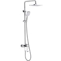 Устройство: душевая система • Смеситель: джойстик • Ручной душ (душевая лейка): размер 110 мм, настройки 3 шт • Верхний душ (тропический): размер 300 мм, настройки 1 шт • Комплектация: ручной душ, верхний душ, смеситель, стойка, шланг, крепление ручного душа