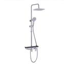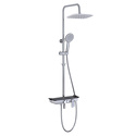 Устройство: душевая система • Смеситель: джойстик • Ручной душ (душевая лейка): размер 120 мм, настройки 4 шт • Верхний душ (тропический): размер 281 мм, настройки 1 шт • Комплектация: ручной душ, верхний душ, смеситель, стойка, шланг, крепление ручного душа, полка