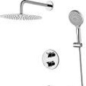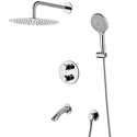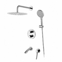 Устройство: душевая система • Смеситель: термостатический • Ручной душ (душевая лейка): размер 124 мм, настройки 3 шт • Верхний душ (тропический): размер 300 мм, настройки 1 шт • Комплектация: ручной душ, верхний душ, смеситель, шланг, крепление ручного душа