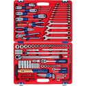 Комплектация– Головки торцевые и принадлежности 1/2"Головки торцевые стандартные 6-гранные – 8, 9, 10, 11, 12, 13, 14, 15, 16, 17, 18, 19, 21, 22, 24, 27, 30, 32 ммГоловки торцевые глубокие 6-гранные – 13, 14, 17, 19, 22 ммГоловки торцевые TORX Е-стандарт – E10, E12, E14, E16, E18, E20, E22, E24Головки свечные 12-гранные – 14, 16 ммУдлинители стандартные – 125, 250 ммТрещотка флажковая с кнопкой – 45 зубцов, длина 250 ммВороток с шарниром – 450 ммКардан – 1 шт.Переходник с отверстием для воротка – 3/8" х 1/2"Переходник адаптер для вставок (бит) – F1/2">F5/16" (8 мм)Ключ динамометрический – диапазон усилий: от 42 до 210 Нм– Головки торцевые и принадлежности 1/4"Головки торцевые стандартные 6-гранные – 4, 4.5, 5, 5.5, 6, 7, 8, 9, 10, 11, 12, 13 ммГоловки торцевые глубокие 6-гранные – 8, 10, 11, 12, 13 ммГоловки торцевые TORX Е-стандарт – E4, E5, E6, E7, E8Удлинители стандартные – 75, 100 ммТрещотка флажковая с кнопкой – 45 зубцов, длина 125 ммВороток скользящий Т-образный – 115 ммКардан – 1 шт.Отвертка-вороток – 150 мм– Насадки торцевые 1/4" (6.35 мм)Крестовые Phillips – PH1, PH2Крестовые Pozidrive – PZ1, PZ2Шлицевые Slotted – 5.5, 7 ммTORX – T8, T10, T15, T20, T25, T27, T30Шестигранные – H3, H4, H5, H6, H7– Вставки (биты) 5/16" (8 мм)Крестовые Phillips – PH3, PH4Крестовые Pozidrive – PZ3, PZ4Шлицевые Slotted – 8, 10, 12 ммTORX – T40, T45, T50, T55, T60Шестигранники – Н3, Н4 ,H5, H6, H7SPLINE – M6, M8, M10, M12– КлючиКлючи комбинированные – 6, 7, 8, 9, 10, 11, 12, 13, 14, 15, 16, 17, 18, 19, 21, 22, 24 мм– ОтверткиКрестовые Phillips – №1 х 75 мм, №2 х 100 мм, №3 х 150 ммШлицевые Slotted – 5.5 х 75 мм, 6.5 х 100 мм, 8.0 х 150 мм– Шарнирно-губцевый инструментПлоскогубцы комбинированные – длина 175 ммБокорезы стандартные – длина 150 ммЗахват переставной – длина 250 мм– Прочий инструментНабор шестигранников – 1.5, 2, 2.5, 3, 4, 5, 6, 8, 10 ммМолоток – 500 грМагнит телескопический – 1 шт.Индикатор напряжения – 6-24 В