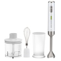 Тип: погружной • Мощность: 700 Вт • Управление: механическое • Количество скоростей: 2 скорости • Турборежим: есть • Венчик для взбивания: есть • Измельчитель: есть, 0.5 л • Материал погружной части: металл • Материал корпуса: пластик • Мерный стакан в комплекте: есть,0.7 л • Длина шнура питания: 1.2 м • Размеры (ШхВхГ): 12x37x12 см • Вес: 1.26 кг