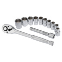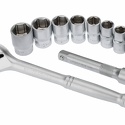 КомплектацияСъемные торцевые головки (10 шт.: 10, 11, 12, 13, 14, 15, 17, 19, 22 и 24 мм) имеют 6-гранный зев и посадочное место для присоединительного квадрата 1/2”.В комплект входят: ключ-трещотка с переключателем, удлинитель 125 мм.