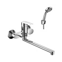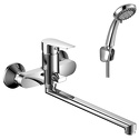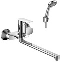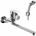 Присоединительный размер - 1\2", Донный клапан - Нет, Цвет - Серебристый, Количество монтажных отверстий - 2, S-образные эксцентрики - Есть, Покрытие - Хром, Ширина - 21.5, Термостат - Нет, Длина излива - 403, Глубина - 41.8, Комплектация - Душевой шланг, Поворотный излив - Да, Встраиваемый - Нет, Материал корпуса - Латунь, Тип - Однозахватный, Тип подводки - Жесткая, Аэратор - Есть, Назначение - Для ванны и душа, Форма излива - Традиционная