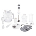 Комплектацияблок электродвигателя;большая чаша с крышкой;- малая чаша с крышкой;- стакан для смешивания с крышкой;- насадка-блендер;- насадка-венчик;- насадка-вспениватель молока;- переходник для насадки-венчика и насадки-вспенивателя молока;- насадка для нарезки кубиками;- насадка для шинковки/терки;- насадка для приготовления драников;- S-образный нож (2 шт.);- горизонтальный нож;- съемная втулка;- толкатель;- приспособление для очистки решетки;- руководство по эксплуатации;- сервисная книжка.