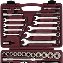 КомплектацияГоловки торцевые 1/4"DR, 6 шт. - 8, 9, 10, 11, 12, 13 ммОтверточная рукоятка 1/4"DR - 150 ммАдаптер для вставок-бит - 1/4"DR х 1/4"НDRВставки-биты - 1/4"HDR L=25 мм, 14 шт. (РН) 1, 2, 3; (SL) 3, 4, 5, 6 мм; (TORX®) Т10, Т15, Т20, Т25, Т27, Т30, Т40Головки торцевые 1/2"DR, 10 шт. - 10, 12, 13, 14, 15, 17, 19, 22, 24, 27 ммГоловки свечные 1/2"DR, 2 шт. - 16, 21 ммТрещоточная рукоятка 1/2"DR - 250 мм, 48 зубцовУдлинитель 1/2"DR - 125 ммШарнир карданный 1/2"DR - 70 ммКлючи шестигранные, 4 шт. - 1.5, 2, 3, 4 ммКлючи комбинированные, 6 шт. - 10, 12, 13, 14, 15, 17 ммМолоток 0,3 кгПассатижи 175 ммКлещи переставные 250 ммОтвертки, 5 шт. - (РН) 2 х 38 мм, 2 х 100 мм; (PZ) 3 х 200 мм / (SL) 6 х 38 мм, 6 х 100 мм