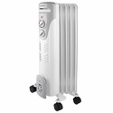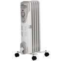 Масляный радиатор • макс. мощность 1 кВт • 5 секций • встроенный вентилятор • колеса для перемещения • ручка • термостат • 134x628x298 мм • вес 5 кг